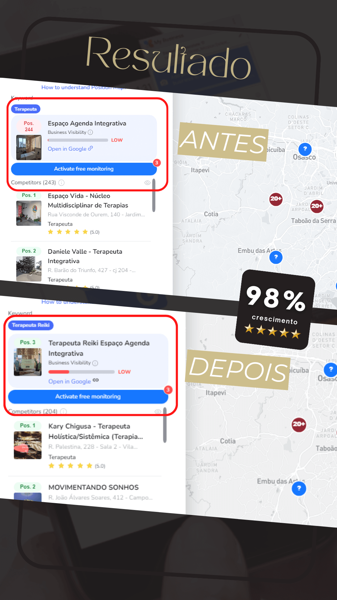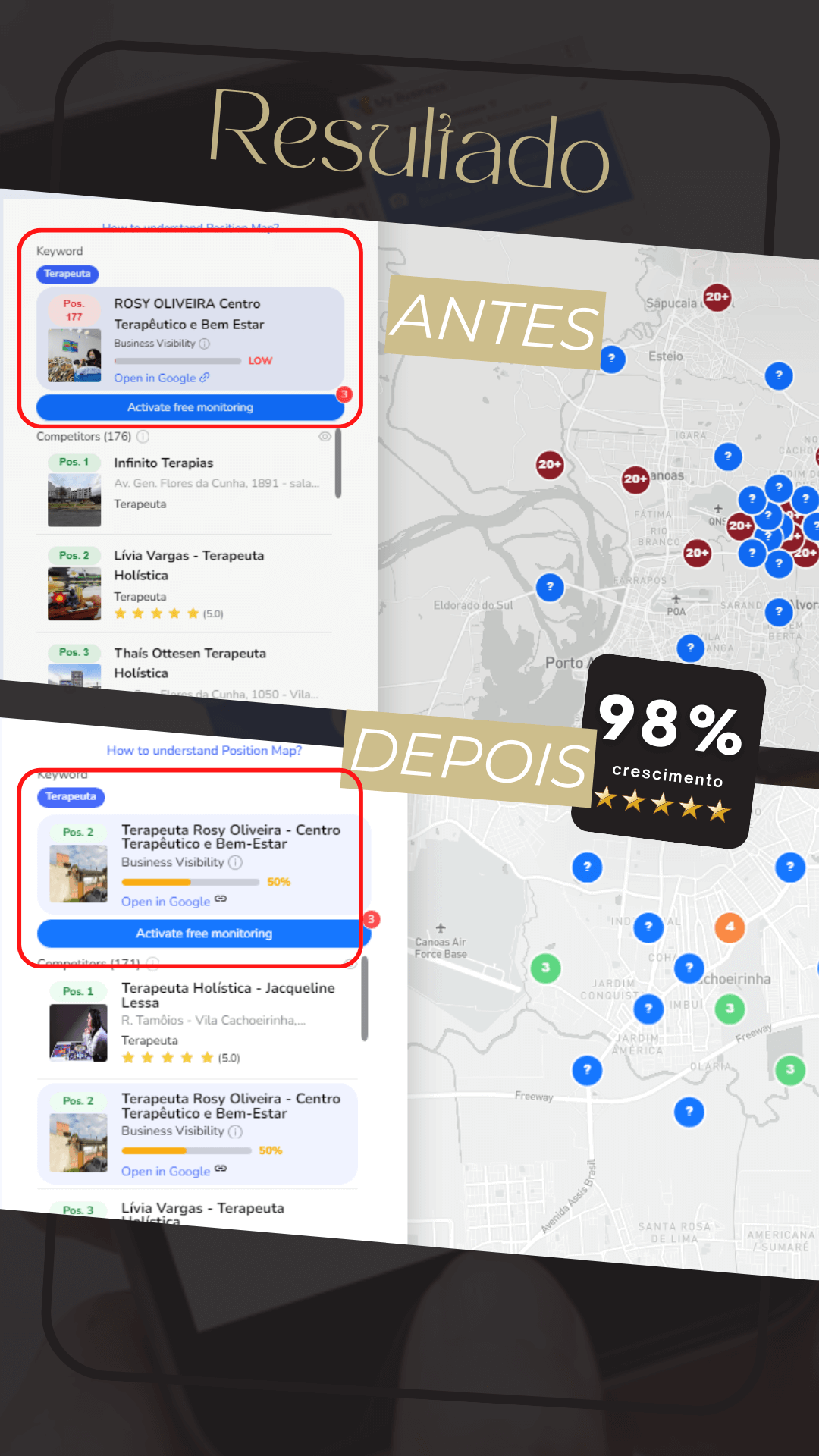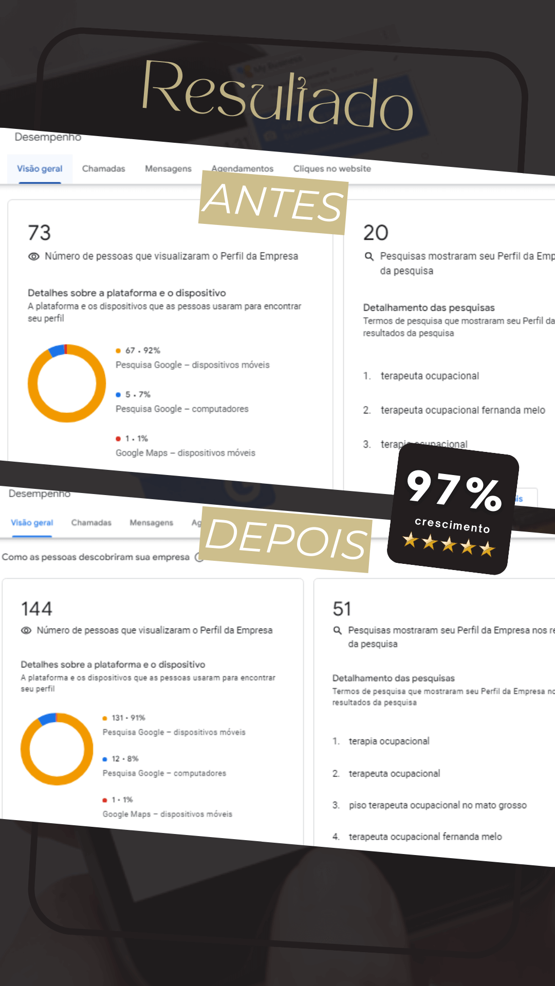 Após concluir o curso, você verá mudanças significativas. Com um perfil bem otimizado, sua empresa aparecerá nas primeiras posições das buscas locais no Google, atraindo mais clientes e aumentando suas vendas. Você também vai perceber um crescimento no número de interações com seu público, com avaliações positivas que elevam a confiança na sua marca. Ao aplicar o que aprendeu, seu negócio se tornará muito mais visível, garantindo que você nunca perca mais clientes para a concorrência.